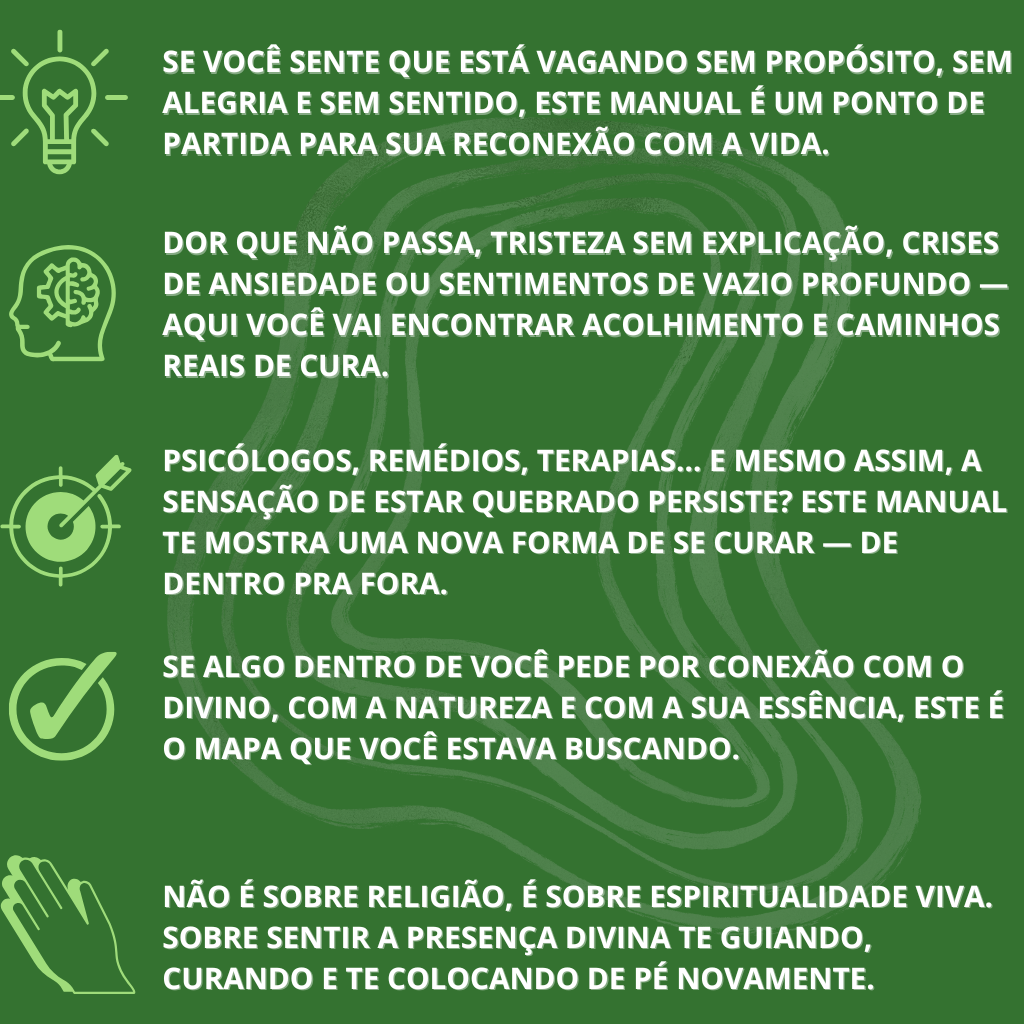Criado por alguém que viveu na pele a dor de estar perdido, sem direção, sem propósito…este manual é mais que um guia: é um mapa de libertação para quem sente que já tentou de tudo — menos aquilo que realmente conecta corpo, alma e espírito.
